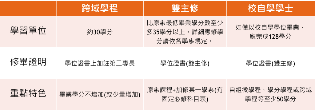 <Q1>「校自學學士」跟跨域學程、雙主修有什麼不一樣呢?